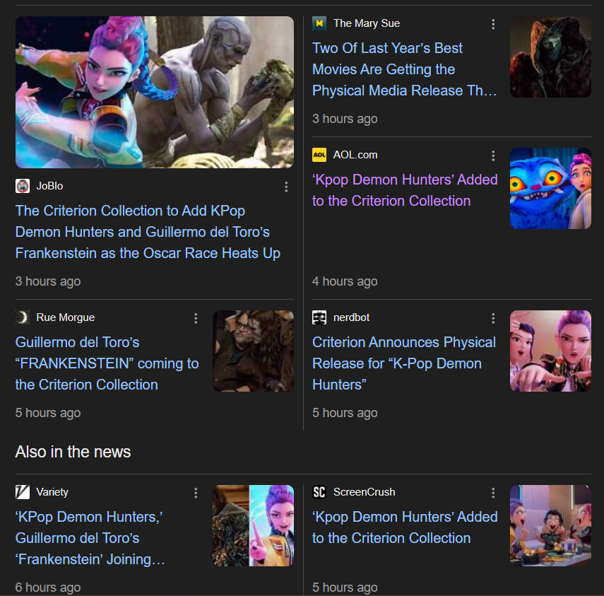 De Netflix, Criterion ont déjà édité “The Irishman” (Martin Scorsese), “Roma” (Alfonso Cuarón), “The Power of the Dog” (Jane Campion), “Marriage Story ” (Noah Baumbach), « Pinocchio » (Del Toro) et s’apprêtent donc à commercialiser Frankenstein 2025 et le film qui a matrixé mes petites nièces.