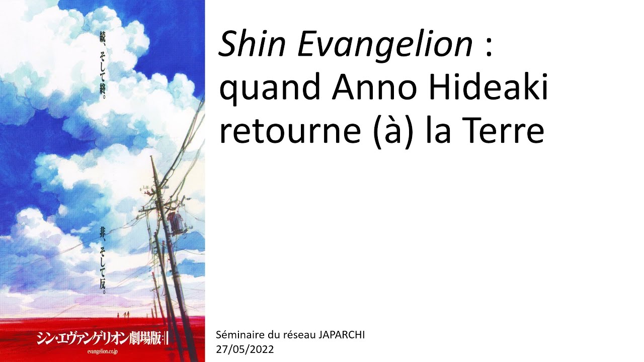 (séminaire du réseau Japarchi 27/05/2022)Dans son dernier long métrage d’animation, Shin Evangelion 『シン・エヴァンゲリオン劇場版: ||』 (Evangelion 3.0+1.0 : Thrice upon a time) (2021), ANNO Hideaki 庵野秀明 propose une longue séquence (40mn sur 2h25) de vie rurale dans une communauté nommée « Troisième village » (Daisan mura 第三村). Comment interpréter la présence et la signification d’un tel insert, donnant à voir une nature à la fois retrouvée et recréée, à rebours des représentations habituelles de ce topos dans les productions narratives japonaises récentes, et au premier abord incongrue dans le contexte d’une franchise de science-fiction comme Evangelion, qui s’est toujours tenue - à l’instar de son auteur - éloignée des questionnements sur le rapport à la nature ?