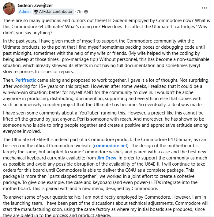 Ok, tous mes doutes viennent de se dissiper, le projet est non seulement validé par Gideon (le créateur de l’Ultimate 64 (la meilleure alternative actuelle), mais ce nouveau C64 EST un Ultimate 64, donc une board qui a déjà toute l’expérience nécessaire, avec manifestement le meilleur boitier et clavier actuel donc c’est vendu, je saute dans le train.