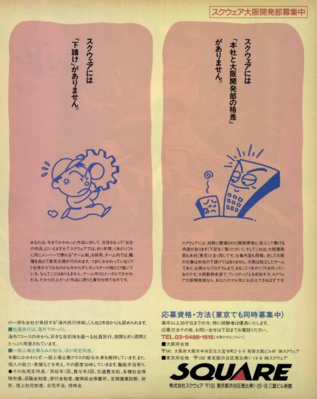 Encore une double page de 1991, cette fois pour Square qui tentait alors de recruter des développeurs et jeunes diplômé(e)s pour son studio d’Osaka, peu après la sortie de Final Fantasy IV et juste au moment où ce studio, ouvert en 1990, allait sortir ses deux premiers jeux, Sa•Ga 3 (Final Fantasy Legend III) et Final Fantasy USA: Mystic Quest.