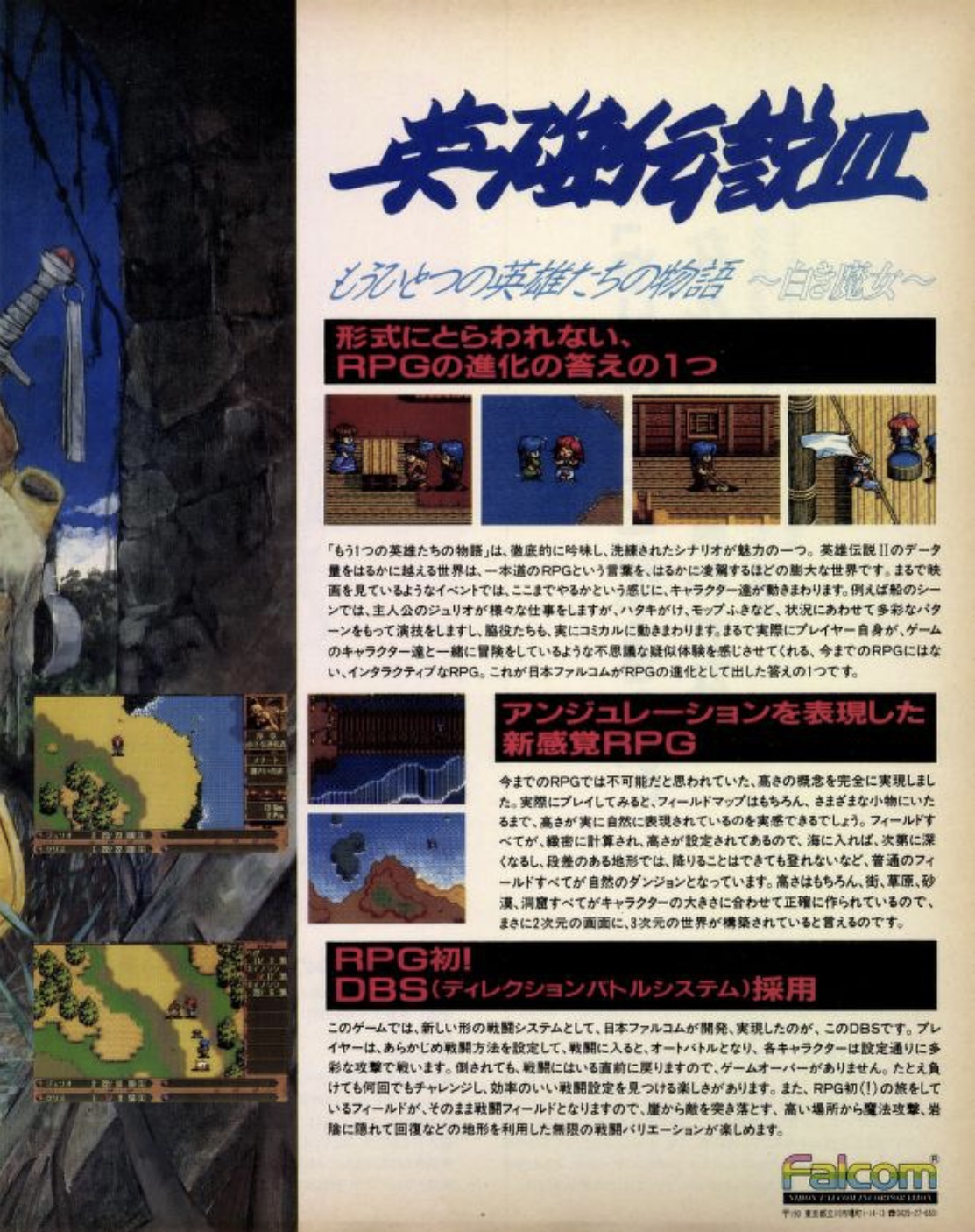 Superbe illustration de Tsuruta Kenji pour la promo de Eiyū Densetsu III ~Shiroki Majo~ en double-page dans un LOGiN de fin 1991.