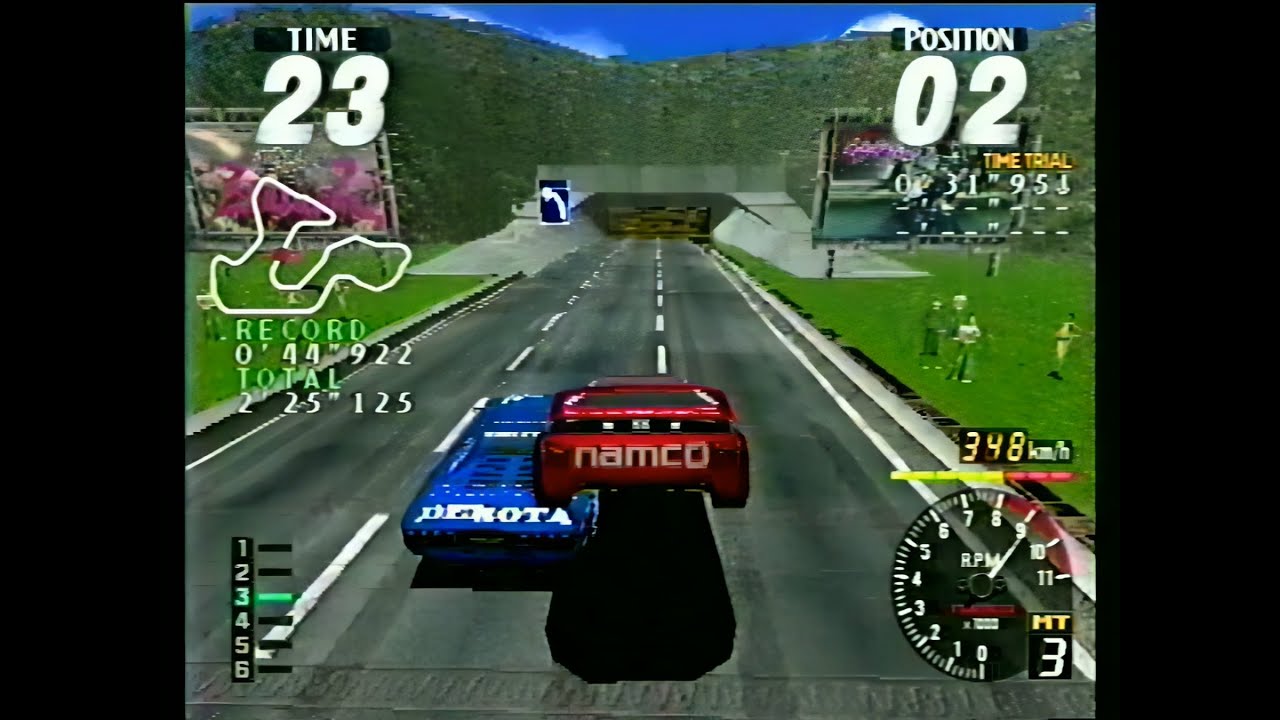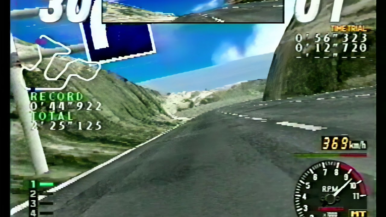 Tout ceci est possible en Manual Transmission grâce à un bug implicant la première vitesse. C’était déjà notoriété publique quand je ponçais Rave Racer en 2004 mais, dans le circuit Mountain, tourner plein gaz à droite et foncer dans le mur derrière nous, comme la France en 2027, provoque un bug qui propulse la bagnole à 370km/h – la limite de vitesse officielle étant 255km/h.